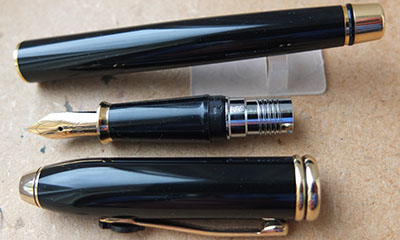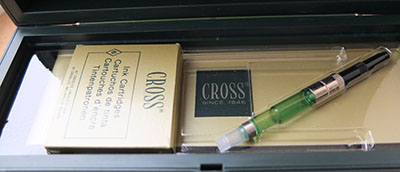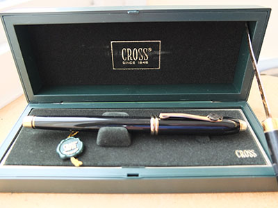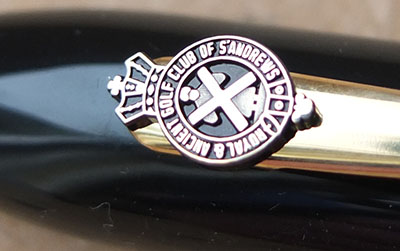 Here is an immaculate-condition uninked unused Cross Townsend fountain pen in black laque with gold-plated trim; there are no surface scratches and no cracks or splits; the pen has a medium grade 14ct gold nib and will write nicely. The pen uses cartridges or a converter and both are here and in its original box with leaflet. This pen has an addition to the clip in the form of a badge showing the 'Royal & Ancient Golf Clun of S'Andrews' which must make this pen of interest to golfers dreaming of playing at St Andrews.